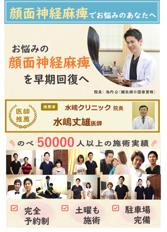 退院前日に、鍼灸が顔面神経麻痺の改善に効果があることを知り、電話で予約をいれて、退院した足でゐろは鍼漢院に参りました。 施術は早ければ早いほど効果があるそうで、 最初のうちは集中的な施術が効果があるとの助言に従い、最初の1か月は週三回通院しました。